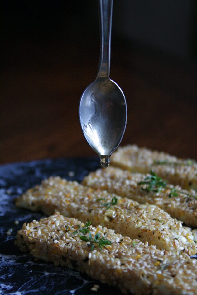 Feta stick al forno – con sesamo, basilico, timo fresco, scorza di limone e miele –