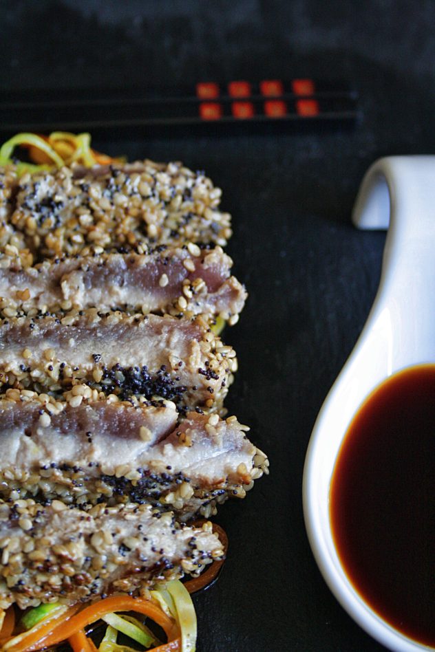 Tataki di tonno in crosta di semi – con carote, zucchine e porro –
