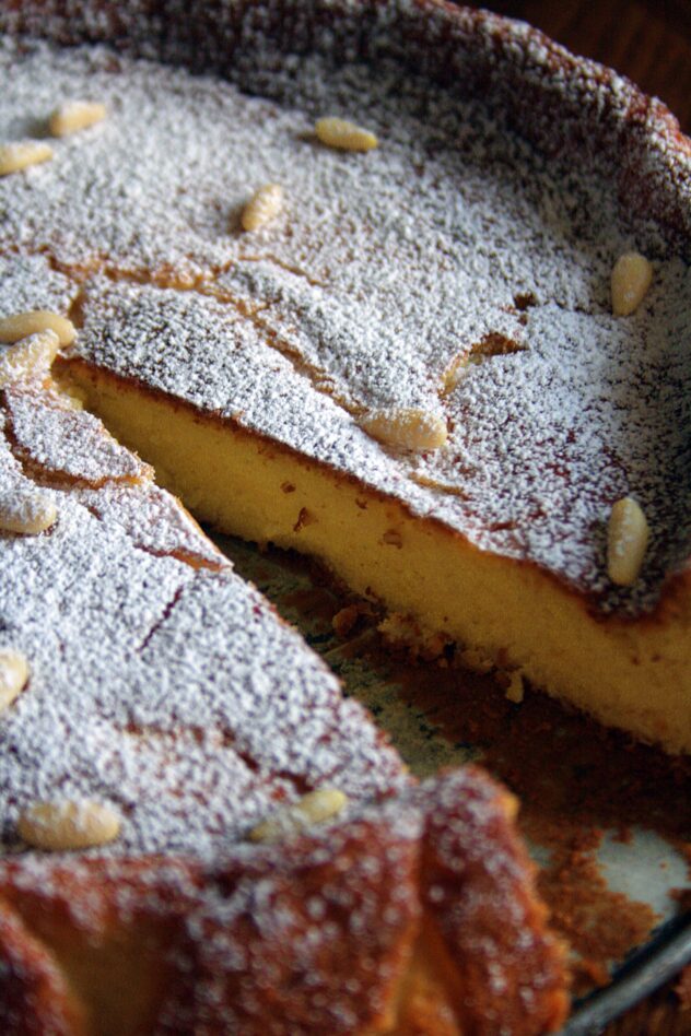 Iniziate dividendo i tuorli dagli albumi e teneteli da parte. Montate il burro morbido con metà dello zucchero (per un burro morbido, bisogna tenerlo fuori frigo almeno 1 ora); continuando a montare, unite i tuorli, uno alla volta, la ricotta, il latte, il cucchiaino di estratto di vaniglia, la scorza del limone, il cocco rapè e in fine la farina setacciata. Quando sarà tutto mescolato, montate gli albumi a neve ferma con il restante zucchero. Una volta montati, uniteli al composto con la ricotta, mescolando dal basso verso l’alto così da non smontare il composto. Ora aggiungete i pinoli tritati grossolanamente ( tenete qualcuno intero per la decorazione) e mescolate delicatamente. Foderate uno stampo da 24 / 26 cm con della carta forno, versate l’impasto, decorate con i pinoli rimasti e infornate ( forno già preriscaldato a 170°/180°C) e fate cuocere per 50 / 60 minuti. Ogni forno cuoce in modo diverso, quindi dopo 30 minuti se vedete che la parte sopra della torta è già bella dorata, coprite con della stagnola e continuate la cottura. Dopo 50 minuti, infilate uno stecchino e controllate la cottura, se viene su quasi asciutto la vostra torta sarà pronta. Toglietela dal forno e fatela raffreddare completamente. Spolverizzate con dello zucchero a velo e servite. Si manterrà in frigorifero per 2/3 giorni.