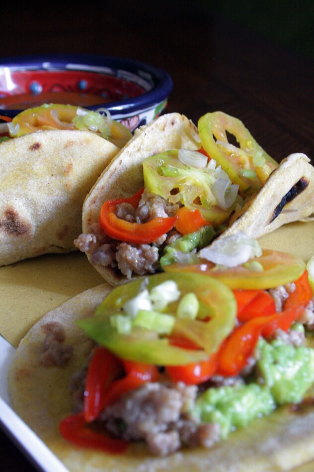 In una ciotola mettete farina, farina di mais, 10ml di olio, acqua e impastate fino ad ottenere un’impasto liscio e omogeneo. Coprite con la pellicola e lasciate riposare in frigorifero fino a che non vi servirà. Lavate il peperone, togliete i semi e tagliatelo a striscioline. Fate cuocere in padella a fuoco basso insieme allo spicchio d’aglio, circa 10/15 minuti (ogni tanto aggiungete qualche cucchiaio di acqua per non far bruciare). Cotto, aggiustate di sale, pepe e trasferite il peperone in un piatto. Nella stessa padella fate cuocere il macinato con un pizzico di peperoncino, ci vorranno 5/6 minuti; successivamente salate e pepate. Aprite l’avocado, togliete l’osso e trasferite la polpa in una ciotola, con l’aiuto di una forchetta schiacciatelo e versate il succo di limone, il cipollotto tritato,  1 cucchiaio di olio, un pizzico di sale e pepe. Amalgamate tutto e tenete a parte. Terminate lavando il pomodoro e tagliatelo a cubetti. Preparati tutti gli ingredienti, non vi resta che preparare i tacos. Togliete dal frigorifero l’impasto e dividetelo in 8/9 palline. Stendetele formando un disco e fate cuocere in una padella antiaderente 1 minuto circa per lato. Man mano che cuocete i tacos copriteli con della stagnola, rimarranno così ben caldi. Ora potete farcirli, avocado, carne, peperone e pomodoro. Se vi piace potete aggiungere anche qualche salsa da accompagnamento, io ho messo quella agrodolce.