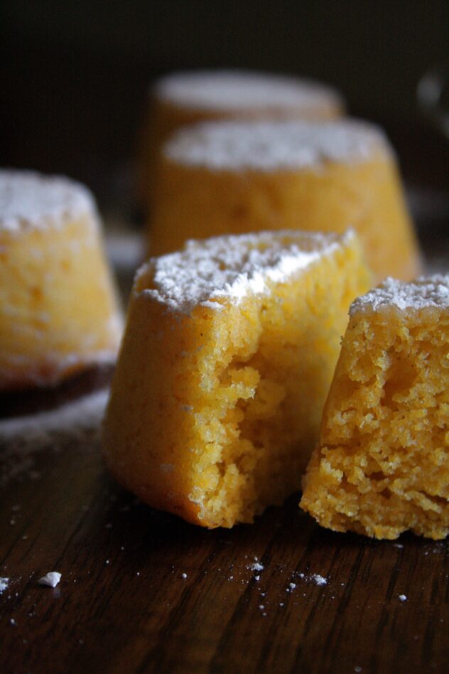 Come prima cosa pelate le carote, togliete la parte iniziale e la parte finale, grattugiatele e versatele in un mixer. Nel mixer insieme le carote aggiungete, olio, estratto di vaniglia, scorza del lime, succo di lime, lo zenzero grattugiato e frullate tutto fino ad ottenere una purea molto fine. A parte montate le uova con lo zucchero fino ad ottenere un composto chiaro e spumoso. Nel composto di uova versate la purea di carote, la farina di mandorle e montate con le fruste per togliete ogni grumo. Successivamente unite anche farina e lievito setacciati. Montate sempre con l’aiuto delle fruste per mescolare. Oliate gli stampini e infarinateli (questo passaggio sarà necessario per la riuscita delle tortine, farà in modo che si staccheranno alla perfezione; anche se avete uno stampo in silicone è importante farlo). Trasferito il composto negli stampini, non riempiteli del tutto, lasciate qualche millimetro dal bordo e infornate, forno preriscaldato a 180° per 18 minuti massimo 20. Ogni forno cuoce in modo diverso, quindi passati 15 minuti fate la prova stecchino. Una volta pronti togliete dal forno, lasciate raffreddare, toglietegli dallo stampo e spolverate con lo zucchero a velo.