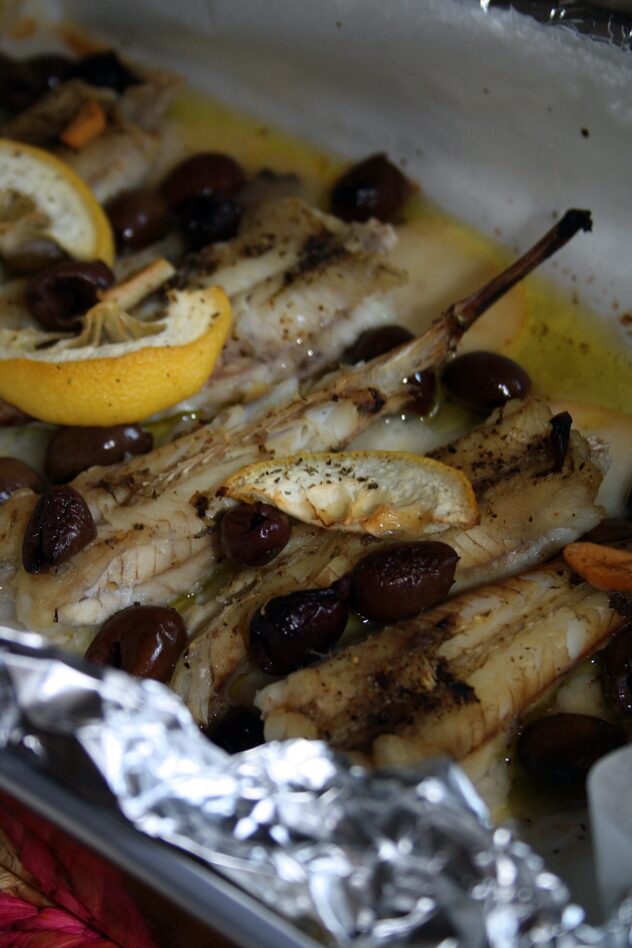 Passate le code sotto l’acqua fredda e sciacquatele bene, tamponate con della carta assorbente e mettete in una teglia coperta con carta forno. Aggiungete un filo d’olio, sale, pepe, origano e lo spicchio d’aglio tagliato a pezzetti grossi. Spremete poi il succo di mezzo limone e versatelo sul pesce (se vi piace potete anche grattugiare la scorza). Mettete anche le olive sgocciolate e infornate a 200°C per 20/25 minuti circa.