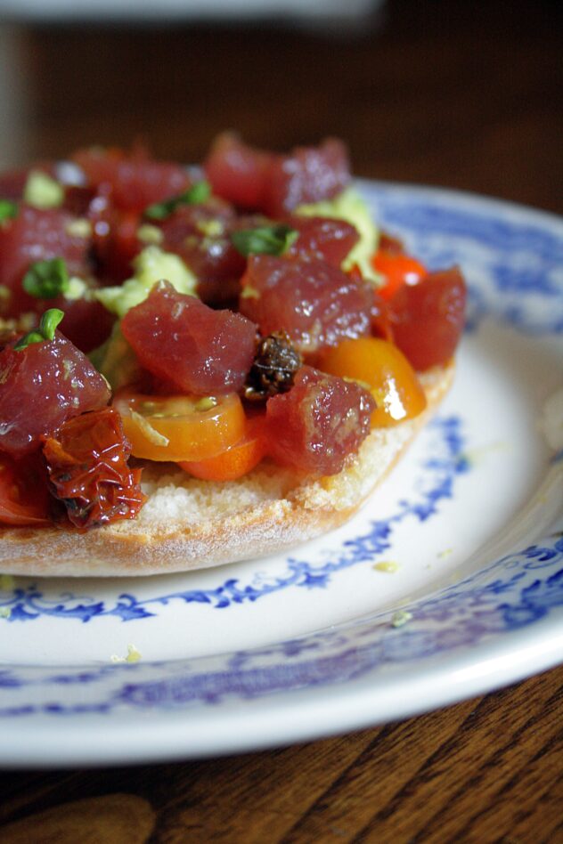 Friselle con pomodoro, tonno allo zenzero, basilico, limone e avocado
