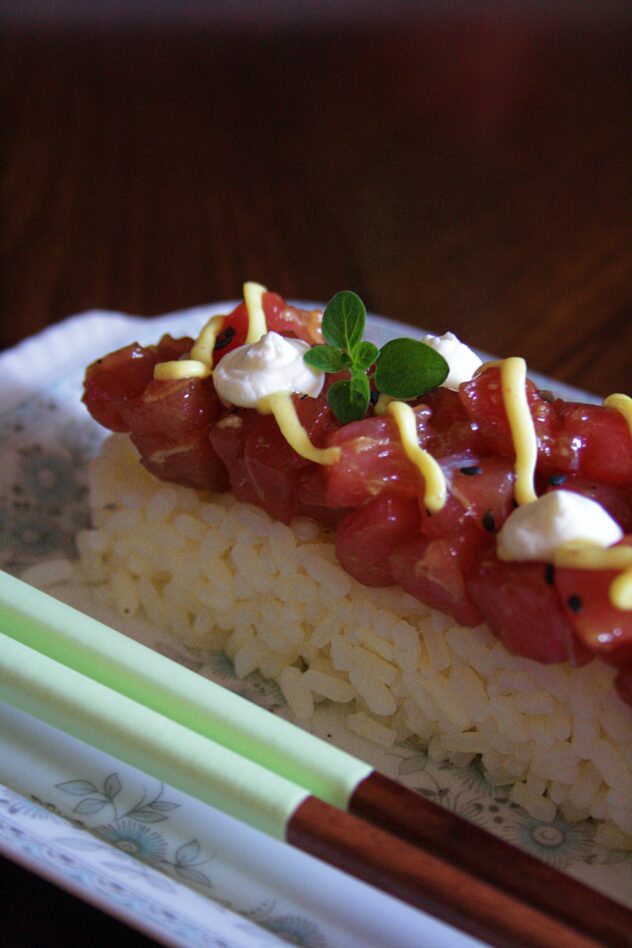 Tartare di tonno al lime, arancia e timo – con philadelphia e maionese veg alla paprika e curcuma –